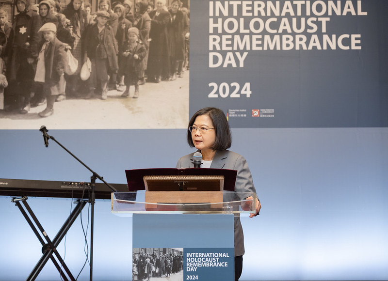 總統以英文致詞,首先感謝駐台北以色列經濟文化辦事處、德國在臺協會、外交部及臺灣民主基金會共同舉辦這項重要活動。她也感謝大家今天撥冗出席,悼念猶太大屠殺罹難者,向生還者致敬,並對所有受到這段人類黑暗歷史影響的人們致意。
