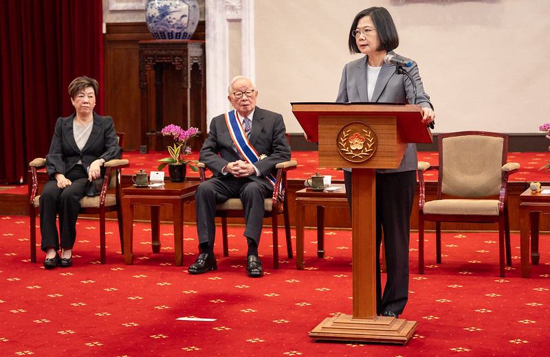 總統致詞時表示,6年前,她同樣在總統府頒贈「一等卿雲勳章」,代表國家感謝張忠謀創辦人對臺灣高科技產業,以及經濟發展的貢獻,感謝他用技術、創新及熱情,讓世界看到臺灣。