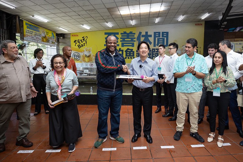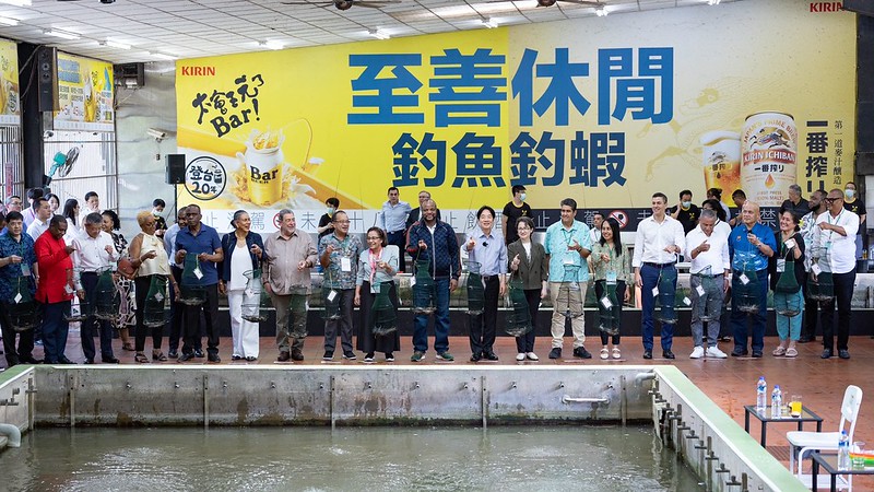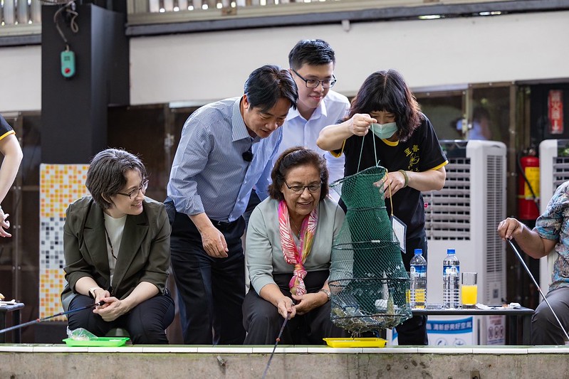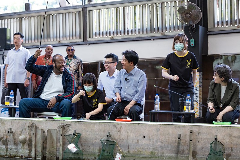 隨後,在至善釣蝦場老闆林聰明教學說明及示範下,副總統、副總統當選人蕭美琴及各國元首共同體驗釣蝦,及品嚐臺南創意小吃。