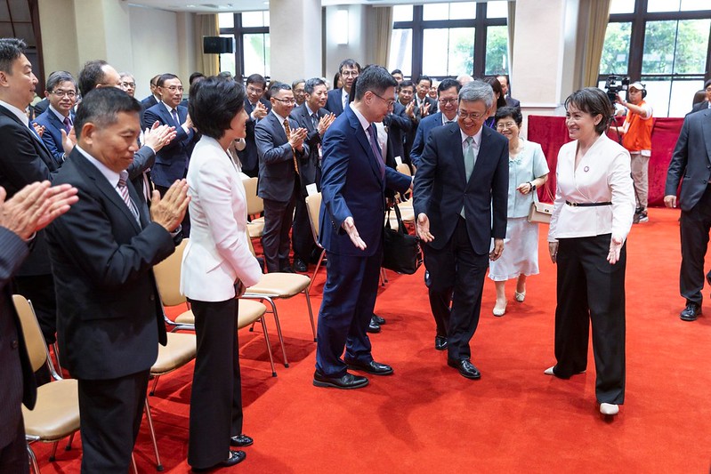 副總統致詞時表示,今天她奉總統之命,擔任行政院卸任及新任院長交接的監交人,深感榮幸,在這全國人民關注的時刻,首先要向卸任、新任院長致上祝賀與祝福。