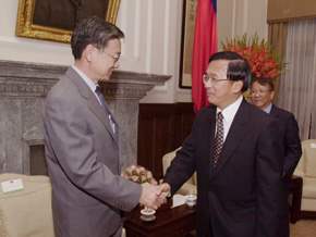 陳總統水扁先生今天在總統府接見國立清華大學教授朱國瑞及胡紀如,肯定他們在基礎科學領域的重大成就與貢獻。