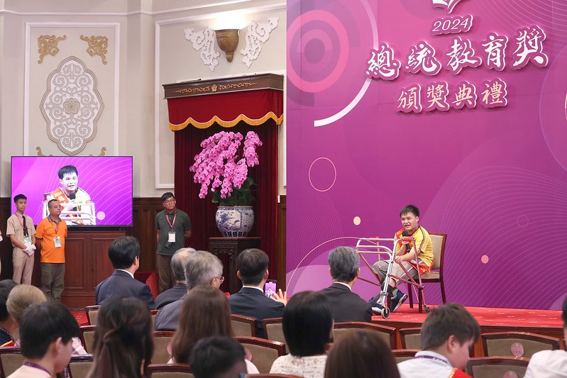 總統恭喜「總統教育獎」的獲獎同學。現場每一位同學都是克服重重逆境,奮發向上,不僅為自己走出人生的光明大道,也讓社會大眾看見生命的光輝。更難能可貴的是,同學們在追求理想同時,也積極協助他人、回饋社會,值得肯定。