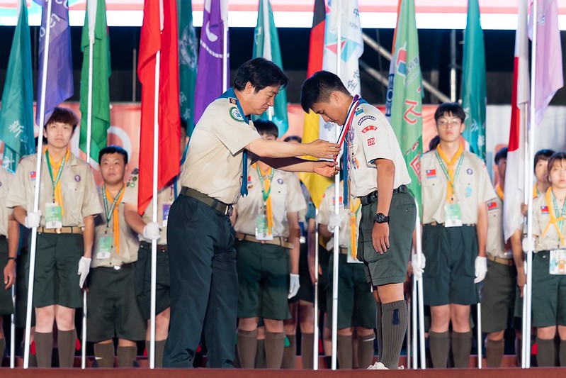 隨後,總統分別頒發「仁愛榮譽章」、「綠玉國花獎章」及「感謝榮譽章」予獲獎者;接著與現場幼童軍一同重溫童軍諾言及合唱中華民國童軍歌。