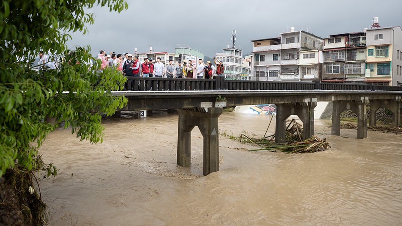 總統抵達高雄美濃區後,首先前往美濃橋,聽取經濟部水利署賴建信署長簡報美濃災情現況與後續因應對策,以及高雄市政府說明高雄淹水情形、防洪設施運作及治水相關需求,並實地了解受損情形。