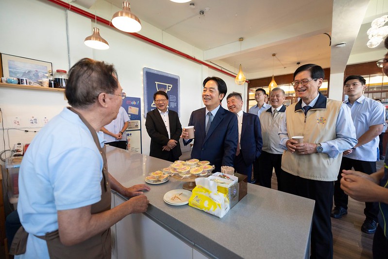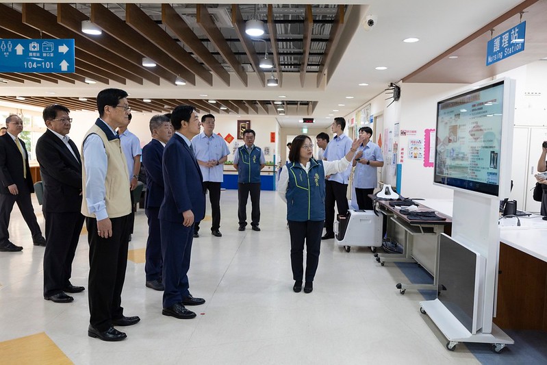 總統抵達後,首先參觀榮民活動區域設施及聽取智能醫療設備介紹,並與榮民長輩親切寒暄互動。