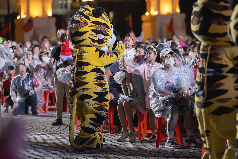 總統接著指出,今晚為國慶光雕特別演出的沈春華、陳亞蘭兩位老師都是大家耳熟能詳的主播和演員。沈春華老師是金鐘獎獲獎紀錄保持人,報導新聞是許多人共同的記憶;陳亞蘭老師演出的《嘉慶君遊臺灣》,更是臺灣史上第一位以女性之姿榮獲金鐘獎最佳戲劇男主角獎的演員,特別要感謝兩位金鐘獎傳奇人物的參與,讓今年國慶光雕展演更加精彩。