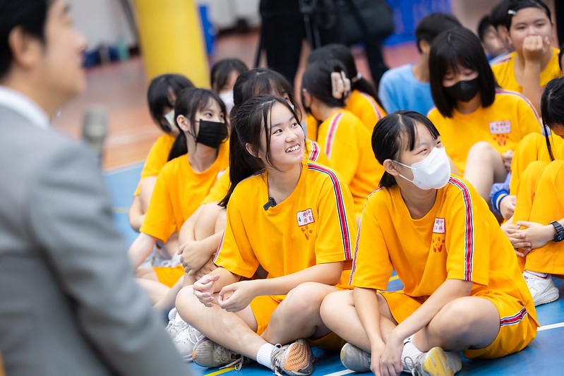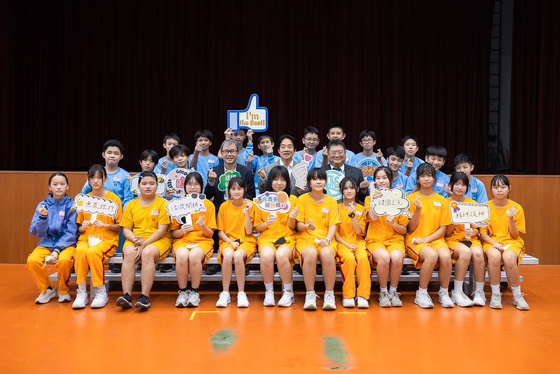 總統表示,今天很高興來到建國國中跟大家見面,莊文凱校長治校嚴謹,校風良好,同學們的表現也都很好。稍早莊校長提到,11月2日校慶運動會即將來臨,同學們都很努力練習大隊接力等賽事,相信一定可以獲得佳績。