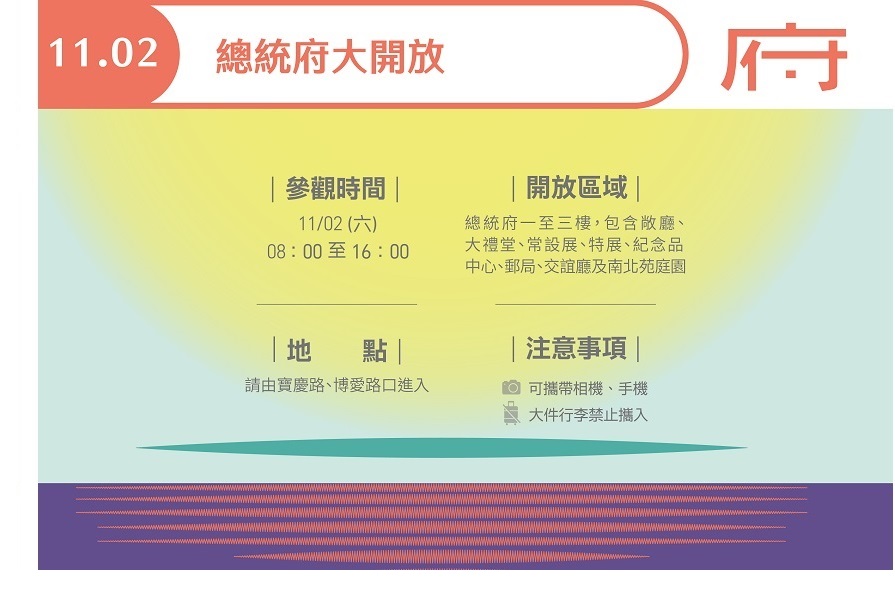 總統府11月2日(週六)上午8時至下午4時開放參觀,開放區域為總統府一至三樓,包括敞廳、大禮堂、「民主方舟:臺灣永續前行」常設展及「超!台!漫!-漫畫裡的臺灣百味」特展、郵局、紀念品中心、交誼廳及南北苑庭園等。