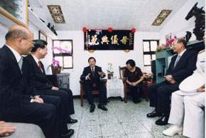 總統由國防部長湯曜明陪同首先拜訪家住台北縣新店市的游月珠女士,游女士年近七十,兒孫輩中計有六人投效軍旅,她的次子、四子、外長孫、長孫、次孫及姪兒皆在國軍任職或就讀軍校,值得一提的是游女士雖出身貧苦,從小失學,父母親亦對之棄養不顧,但她仍樂天知命,對人充滿憐憫及感恩之心,除撫育五名子女外,仍侍奉親長終老;總統對於游女士的感人的事蹟特別表達推崇與敬佩之意;總統說,游女士雖無顯赫的學歷,但身教就是最好的言教,她不向命運低頭、懂得知足感恩、由於深受失學之苦而特別重視子女的教育,讓晚輩一生受益不盡,如今兒孫長大成人並且投身軍旅、報效國家,一生的辛苦也是值得的。