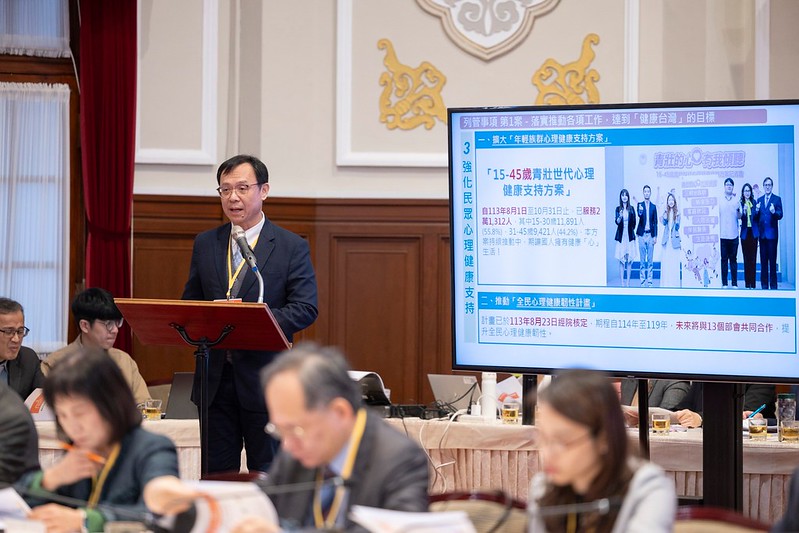 隨後,總統聽取副執行秘書暨中央健康保險署署長石崇良報告「第1次委員會議列管事項辦理情形」,衛福部次長林靜儀與教育部次長林騰蛟聯合報告「提升民眾心理健康韌性」,以及衛福部次長周志浩報告「強化癌症防治策略」。接著就報告事項與委員們進行意見交流。