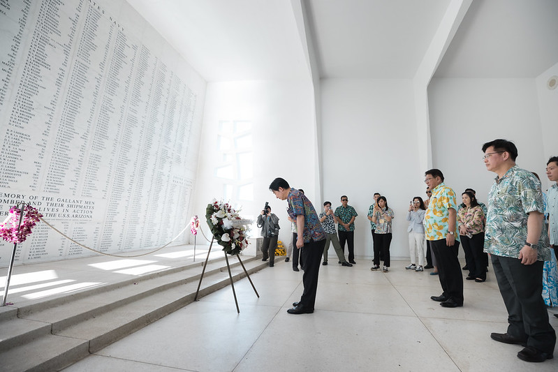 接著,總統前往「珍珠港國家紀念館」並搭乘接駁渡輪至「亞利桑納號戰艦紀念館」,於陣亡將士名錄花圈前鞠躬致意,並撒花瓣至悼念池,向珍珠港事變中,於亞利桑納號戰艦壯烈犧牲的英魂表達敬意,隨後亦停留於亞利桑納號平面圖前聽取解說。
