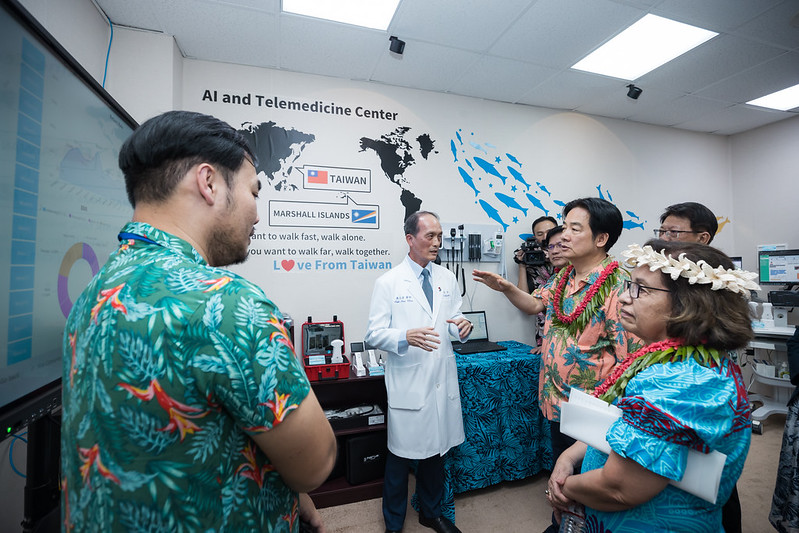 賴清德總統「繁榮南島 智慧永續」之旅於當地時間3日下午(臺北時間3日午間)出席「馬久羅醫院人工智慧暨遠距醫療中心」成立剪綵儀式暨視察「馬紹爾群島及臺灣駐馬國技術團市集」。