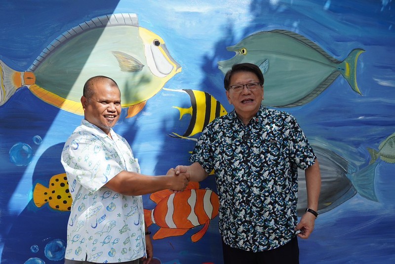 潘秘書長抵達帛琉國家水產中心後,首先觀賞水產養殖計畫成果影片,隨後與帛琉農漁暨環境部長維克多(Steven Victor)共同在介紹漁業永續發展之彩繪牆面上點睛,並致贈文具予參與學童,現場氣氛溫馨融洽。