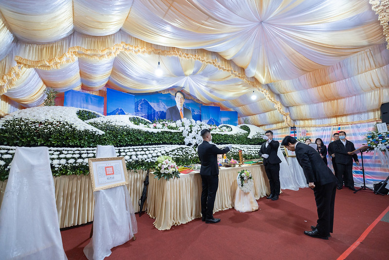 總統抵達會場後,首先頒發褒揚令,由總統府國策顧問彭添富長男彭俊豪先生代表接受。隨後在司儀引領下於靈前獻花,行三鞠躬禮致祭。離場前,總統也向家屬慰問致意。