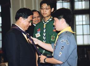 世界童子軍亞太區辦事處主任金奎泳致詞時則再度向總統表達恭賀之意,並稱許中國童子軍傑出的表現,曾經造就了許多世界級的童軍領袖,如現任理事長高銘輝及已故的鄧傳楷先生。他並希望我國政府及人民能夠全力支持二OO四年的世界羅浮大會活動。他說,身為童子軍,他會秉持四海之內皆兄弟的精神來支持中華民國。