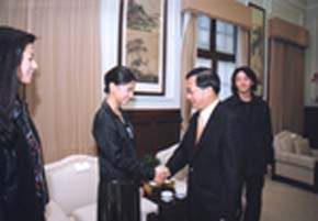 電影「愛你愛我」工作人員代表焦雄屏(製片)、徐小明(製片)、林正盛(導演)、柯淑卿(林正盛導演夫人)、徐秉熙(監製)及演員張震、李心潔、郭靜純等人上午是由行政院新聞局長蘇正平陪同,前來總統府晉見總統,總統府副秘書長簡又新也在座。