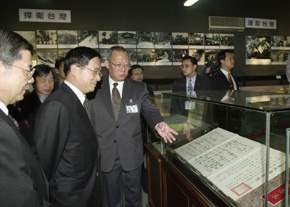 陳總統水扁先生今天下午由內政部部長張博雅、總統府副秘書長陳哲男陪同,參觀在總統府內所舉辦的「典籍史料特展」。