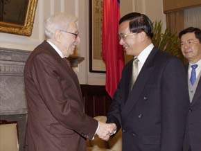 陳總統水扁先生今天接見美國全球網貿集團(ICES)首席顧問、前聯邦眾議院國際關係委員會亞太小組主席伍爾夫(Lester L. Wolff)及華爾街金融領袖戴維斯(Morton Davis),對他們遠道來訪,代表政府及人民表達歡迎之意。