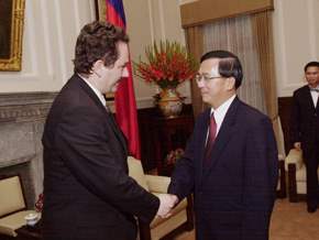 總統接著談到,在公元二○○○年,中華民國完成了歷史上第一次的政黨輪替與政權和平轉移,我們以此民主成就為傲,雖然我們必須面對許多挑戰,但這是一個轉機,也是一個契機,我們必能加以把握,進而創造新局。總統也希望Bouverat主席能藉著此次訪華的機會,見證我們在民主上的進步與成就。