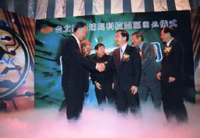 去年五月廿八日「鴻海」的郭董事長親自打電話給蘇縣長,表示希望台北縣投資的意願,請縣政府幫忙尋找適當的投資地點。不到一年的時間,台北縣土城「頂埔高科技園區」正式誕生了,完成今天的圈地作業,不論是廠商的建廠工程,或是園區內公共設施的推動,馬上就要全面的展開。在這將近一年的時間裡,由於中央與地方政府的密切配合,不但在一一五天之內,完成了都市計畫的變更,更協調軍方同步將位於園區內的「陸軍後勤學校土城分部」完成全部搬遷。