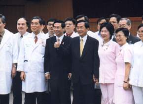 陳總統水扁先生今天上午視導衛生署疾病管制局後,隨即在衛生署涂醒哲署長的陪同下,前往台大醫院關心SARS疫情防治措施,及聽取相關研究成果報告。總統並深深一鞠躬,代表政府及人民向所有的醫護、研究人員等,表達最高的敬意和誠摯的謝意。總統也表示,台灣不是世界衛生組織(WHO)的會員國,沒有辦法在第一時間就獲得WHO對SARS所掌握的資訊,但當第一個SARS病例送到台大醫院治療,台大醫院就立刻發出警訊,並緊急完成隔離措施,在危機還沒有爆發前就把疫情控制在最小範圍。台大醫院在這次SARS防疫上的貢獻真是「功德無量」。