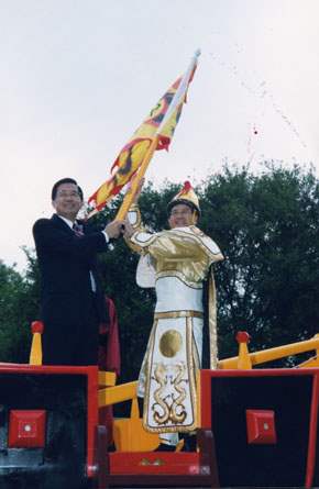 陳總統水扁先生今天下午前往台南,參加台南鄭成功文化節開幕活動,除與台南市長許添財共同主持「戎克船」揭船儀式外,兩人並登上這艘仿造三百四十二年前鄭成功來台時使用的戰船,總統也仿古禮在授予代表大將軍的許市長帥旗後,與許市長共同欣賞升旗及升帆儀式,為這場別開生面的活動揭開序幕。