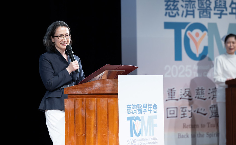 副總統致詞時表示,今天非常榮幸受邀參加「2025慈濟醫學年會」,為在醫療及科學領域有重大貢獻的先進們頒獎。她也向證嚴上人及靜思精舍的師父們表達崇高敬意,感謝他們的護持,讓今年慈濟醫學年會能夠重返花蓮擴大舉辦,讓花蓮不再是醫療的後山,而是引領臺灣醫學持續進步,甚至是醫療結合科技、教育的先驅者。