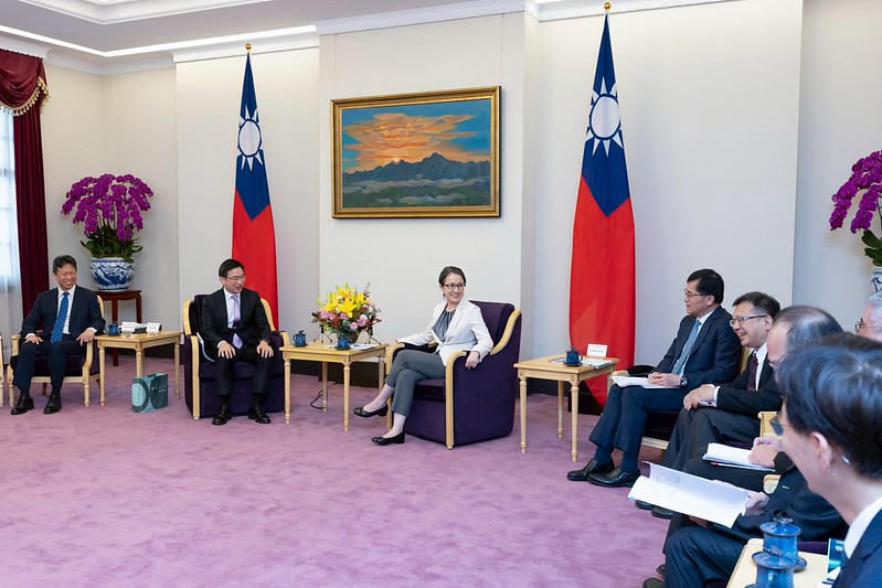 訪賓一行由中華民國創業投資商業同業公會理事長邱德成率領,經濟部次長何晉滄、國發會副主任委員詹方冠及金管會主任秘書林志吉陪同,前來總統府拜會副總統。