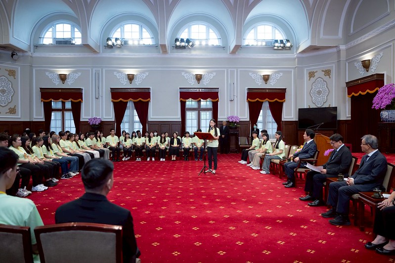 訪賓一行由教育部長鄭英耀及青年發展署署長陳雪玉陪同,前來總統府晉見總統,總統府秘書長潘孟安也在座。