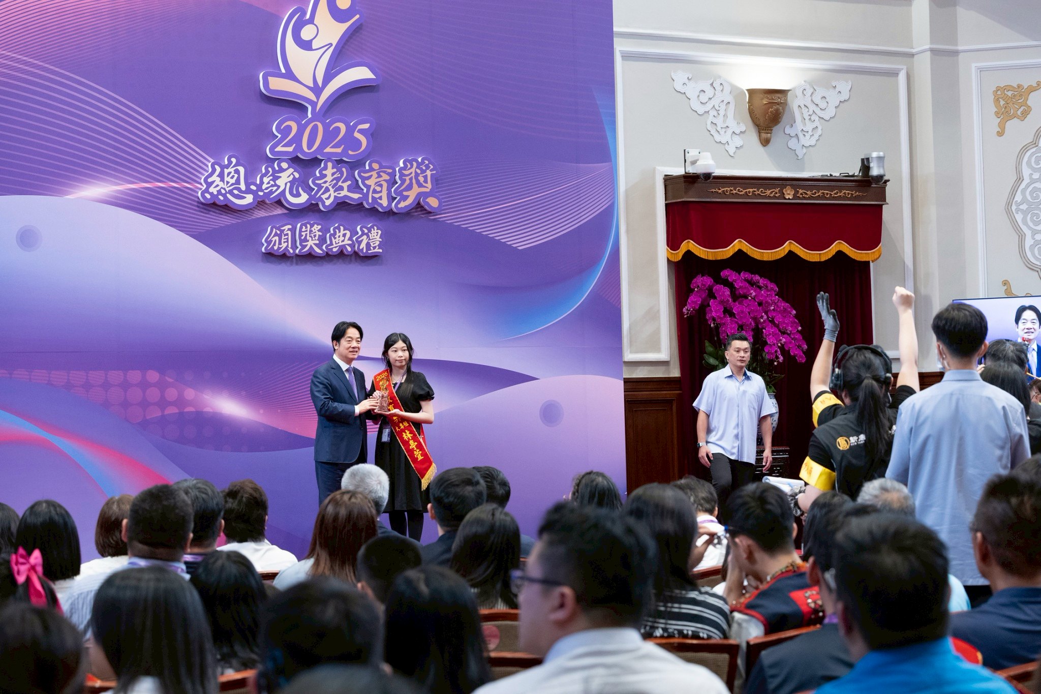 隨後,總統一一頒獎予獲獎同學。「2025總統教育獎」得獎同學包括國小組:方珩、王諄、陳秉希、羅弘輔、李奕霈、尹雅汕、許知貽、蘇翊捷、曾盼儒、康晉豪、吳昌玹、許博彥、汪麗晴、汪佑叡、潘聖捷、黃昊恩、曾釩銨、李婭晨等18名;國中組:謝昇舜、王潔沂、吳承翰、何亭維、陳婕渝、連沛瑜、曾祈恩、楊貴東、陳宥穎、田萱、謝至程、游佩璇、林言彤、董晏鈞、莊凱丞、潘梓宣、邱奇希、劉玉婷等18名;高中組:王實修、王辰瀚、林佳勳、蔡秉澄、吳俊佑、彭宥彤、林歆璇、莊宇僑、陳柏呈、翼友福、林宇涵、劉嘉欣、盧琮鈞、陳詩涵等14名;大專組:許樂、鄭漢琮、林亭萓、林育夙、賴欣儀、鄭成鼎、許汯洧、林宸緯、詹博丞、蔡奕琳等10名。