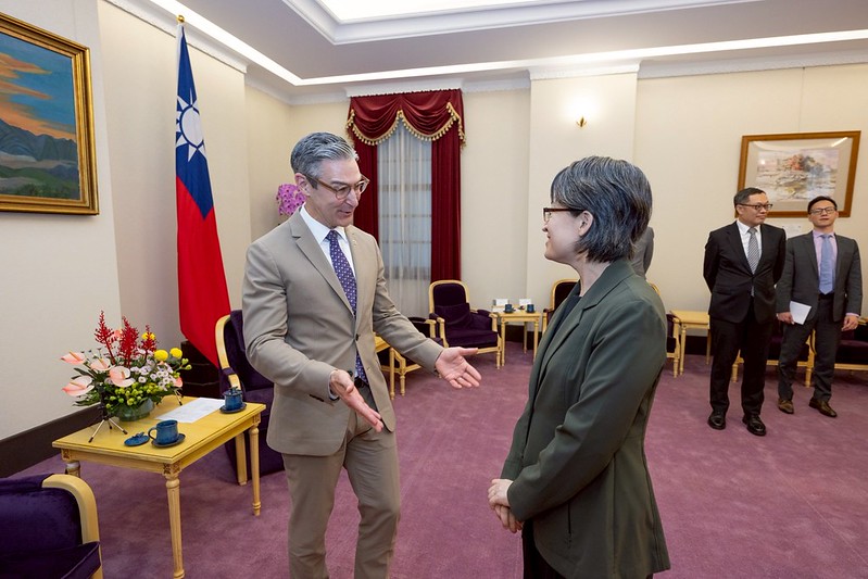 訪團由美國「國家民主基金會」會長暨執行長威爾遜(Damon Wilson)率領,外交部次長陳明祺陪同,前來總統府拜會副總統。