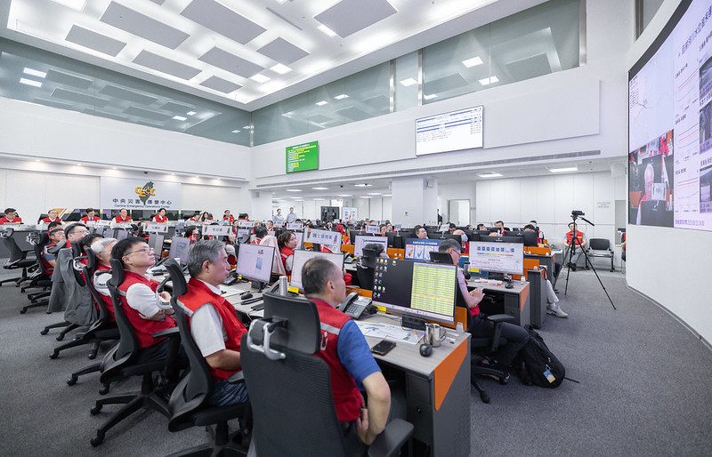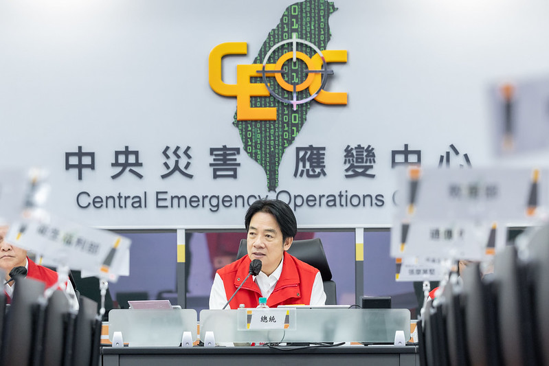 總統抵達後首先聽取簡報,並與臺東縣、高雄市及澎湖縣等地方政府首長進行視訊連線,了解各地目前防災整備情形。