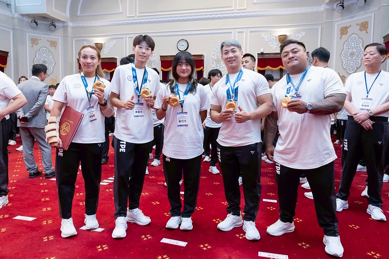 總統首先提到「健力」項目。七朝老將謝宗庭率先拿下輕量級銀牌、江凱傑在硬舉奪下中量級金牌,楊森更是蹲舉453.5公斤打破世界紀錄、總和破大會紀錄。楊森比賽時眼睛充滿血絲,許多國人也流下感動的眼淚。感謝楊森把臺灣扛起來、扛給世界看,不只是排灣族的勇士,更是臺灣的大力士。
