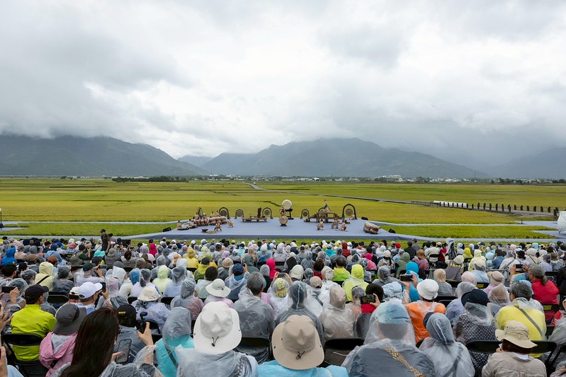 活動現場,副總統與鄉親共同欣賞由優人神鼓與歌手桑布伊合作演出的《我回來了─做一部作品給自己的靈魂!》。這齣作品以「勇氣、信任與回家」為主題,透過鼓聲、歌聲與肢體的節奏,描繪人與土地、傳統與當代、自然與靈魂間的深刻連結。隨著節奏在稻浪間迴盪,觀眾無不被「池上秋收稻穗藝術節」的獨特氛圍所感動。
