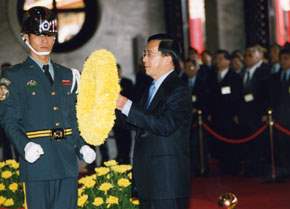 上午九時正,在崇戎樂聲中,總統由總統府秘書長邱義仁陪同抵達忠烈祠。