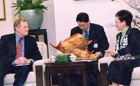 思科公司Carney副總裁等一行,上午是由交通大學校長張俊彥陪同前來總統府晉見副總統,會後副總統並贈送具有台灣地方特色的原住民筆筒給訪賓,做為此行留念。