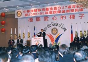 陳總統水扁先生今天下午應邀出席「中華扶輪教育基金會創立二十七週年紀念暨年度獎學金頒獎典禮」,總統致詞時首先代表政府恭賀中華扶輪教育基金會創立二十七週年誌慶。同時也以扶輪社大家庭的一份子,感謝全國一萬六仟餘名社友,凝結力量在中華扶輪教育基金會的組織下,秉承扶輪精神,致力於文化教育的遠大目標。