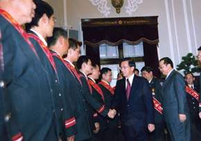 陳總統水扁先生今天下午在總統府接見九十一年度全國消防及義消楷模「鳳凰獎」得獎人,對於他們在工作崗位上的英勇表現以及犧牲奉獻的成就,代表政府與全體國人表達最崇高的謝意與敬意。