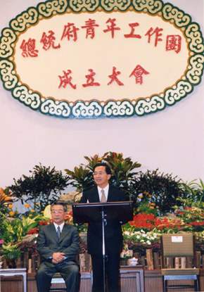 現在,阿扁要高興的宣布,總統府「青年工作團」正式成立!根據阿扁的了解,在場的「青年工作團」朋友們都是國內、外學經歷優秀的青年才俊,有人當過老師、記者、工程師,有的人擁有非常豐富的社團服務經驗,有的人曾經在廣告界工作,有人會說多國語言,各位能夠在眾多競爭者中雀屏中選,成為青年團的一員,阿扁要表示恭賀與誠摰的歡迎,也深深為這批可以說是「臥虎藏龍」的總統府生力軍寄予殷切的期盼。