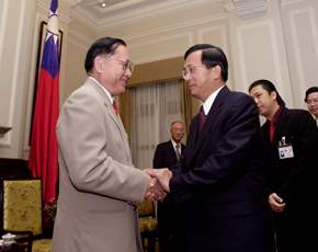 陳總統水扁先生今天上午接見泰國參議院科技能源委員會主席魏悌亞(Wittaya Masayna)及其所率領的參議院議員暨台商總會青年外交訪問團成員,總統並對訪團一行的來訪表達誠摯歡迎之意。