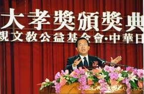 稍後,總統也出席由吳修齊紀念雙親文教公益基金會所主辦的「九十一年全國大孝獎頒獎典禮」,並親自頒獎給大會得獎人,總統致詞時表示,大孝獎到今年已經是第十二年,每年都辦得非常的成功。這完全是因為主辦單位堅持以大公無私的態度,每年投入大量的人力和物力,去探訪很多使人敬佩的孝行。而大孝獎的頒發,不但對這些孝順父母的兒女,是一種肯定和光榮,更透過表揚的活動,讓最真、最美、最善的孝心,傳給社會眾人都能知道,對弘揚孝道,促進社會的和諧,有非常大的幫助。