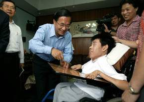 陳總統水扁先生今天上午前往新竹市探視第三屆總統教育獎高中組得獎者顏子傑同學,對於顏子傑同學雖患有先天運動神經元病變,致使四肢萎縮,但仍然用心、用意志,堅強奮發向上,今年更考上明新科技大學資訊管理科,總統特別表示肯定和敬佩。總統並強調,一個人是否偉大,不是看他的高度,而是看他對人生的態度。而顏子傑同學這種樂觀、進取,在惡劣條件之下不向命運低頭,力求自立、開創未來的人生態度,就是真正「台灣之子」的精神。