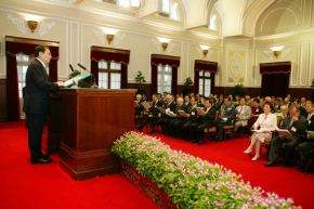 總統府今天舉行中樞紀念大成至聖先師孔子誕辰典禮,陳總統水扁先生親臨主持,並聽取世新大學校長牟宗燦以「高等教育的挑戰與展望」為題所作的專題報告。