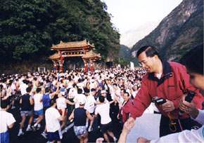 陳總統水扁先生今天早上前往花蓮太魯閣參加二○○二太魯閣中華汽車盃國際馬拉松路跑活動,總統首先為馬拉松組及半馬拉松組起跑鳴槍,之後則參加一公里的首長競跑及為全民健跑組起跑鳴槍。