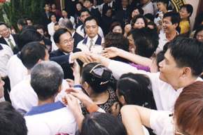 秋季大典的意義,令阿扁感觸良深。阿扁的心境和大家一樣,就像一貫道道親為國家、為社會的奉獻,是無私、無我、無怨、無悔。自擔任總統以來,阿扁一心一意要台灣站起來,建立經濟繁榮的綠色矽島、小而能的廉潔政府、平安和諧的家庭社會,以及和解和平的兩岸局面,同時也要挺胸走入國際社會,為台灣的永續發展努力和打拼,這樣的執政目標,阿扁相信一定可以達成。