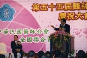 陳總統水扁先生今天下午參加中華民國醫師公會全國聯合會第五十五屆醫師節慶祝大會,並代表政府與人民祝賀全國的醫師佳節快樂,也對他們平日照顧病患、維護國人健康的辛勞與熱誠,表達最高的敬意。