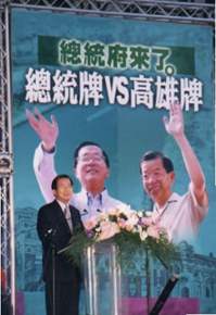 阿扁相信,在謝市長卓越的帶領下,整個高雄市已經邁入重大建設的階段,例如,我們放眼望去就看到愛河整治以及景觀工程成功的傑出成果,有效的改善社區環境與河川水質,讓謝市長打造高雄成為水岸城市與國際港都的夢想逐步實現。其他諸如前鎮河整治、捷運動工、衛生下水道接管、軟體科技園區動土等重要建設,也都讓高雄很快將與世界接軌。