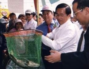今天非常高興應邀前來主持「石斑魚文化節」的開幕,能為地方創造商機,能為漁民朋友賺大錢,是阿扁最感到高興的事,以後只要有機會,阿扁一定要親自來幫大家推銷。最後,敬祝各位身體健康、萬事如意、活動圓滿成功、人人賺大錢!