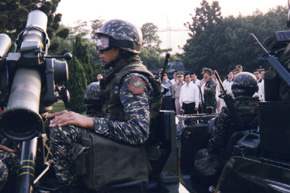 因此,我們必須體認,沒有實力就沒有和平,我們從未放棄改善兩岸關係、促進台海和平的努力,更不希望與中共作惡性的軍備競賽,而國軍的多項建設,目的也不在與中共為敵,而是在確保台海安全,使共軍不敢、不能輕率對我二千三百萬人民動武。國際社會更不能放任、坐視中共對台海、對亞太區域和平日甚一日的武力威脅,國人也不能以為我們只要先放下武器就能得到和平,這是危險的失敗主義,也是虛無的和平,更是變相的投降,所以,阿扁要誠懇的拜託國人、朝野各界,不分黨派支持國防建設,才能使我國的民主政治、人權、和平,永續發展。