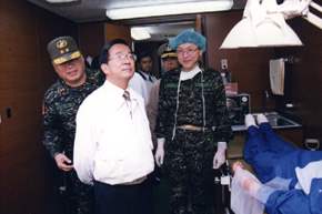 陳總統水扁先生今天下午前往高雄左營海軍軍區視導陸戰隊,除對他們保鄉衛國的努力與辛苦,表達肯定與嘉勉外,並以「承襲光榮歷史,擔負國軍重任」、「做好領導統御,鞏固部隊團結」、「認知國軍角色,增進軍民互動」及「支持全民國防,確保國家安全」與國軍官兵共勉。